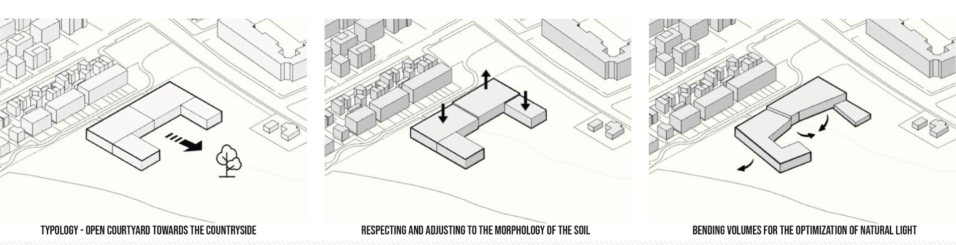 The project is made in collaboration with D. Agostini as part of university project. The building is located in the northern suburbs of Rome, close to a natural reserve and mainly surrounded by the fields. The side towards the city keeps the same straight alignment of the fronting buildings; instead, the opposite front opens in a large courtyard facing the Roman countryside. The garden is delimited by the wing of the gym and the canteen; this is partially undergrounded for not closing the visual and for creating a livable rooftop accessible from a green hill.