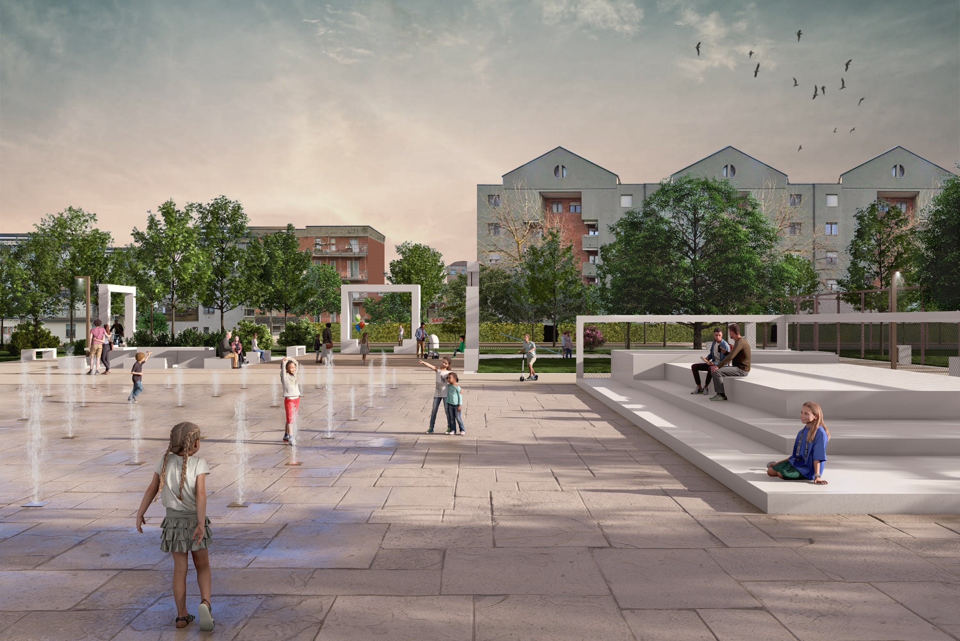 The theme of the competition was centered in designing safe public spaces for pedestrians in Gorgonzola, Milano. As a starting point we decided to focus on the community's needs, the opportunities of the plot and its issues. The area seems to be excluded from the historical center because of the invadent presence of a street that divides the area (and the park) from the city. The main goal was to create a safe place that can re-stitch the area to the city acting as "the missing piece" that can also provide a lively space for gathering and enjoying different activities. The entire area is now paved with local stone except the green area. As a distinctive mark, a white continuous edge connects the spaces and transform itself: first it's a bench, then it becomes a swing, then a portal, then a fountain..For achieving all of this, an accurate study on the mobility was needed: cars can now take an alternative path and coexist with pedestrians.
